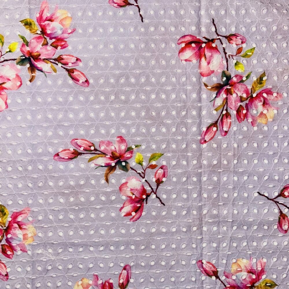 Modal satin fabric featuring a soft, silky texture and a floral pattern. The modal satin base adds a luxurious sheen and a comfortable drape.